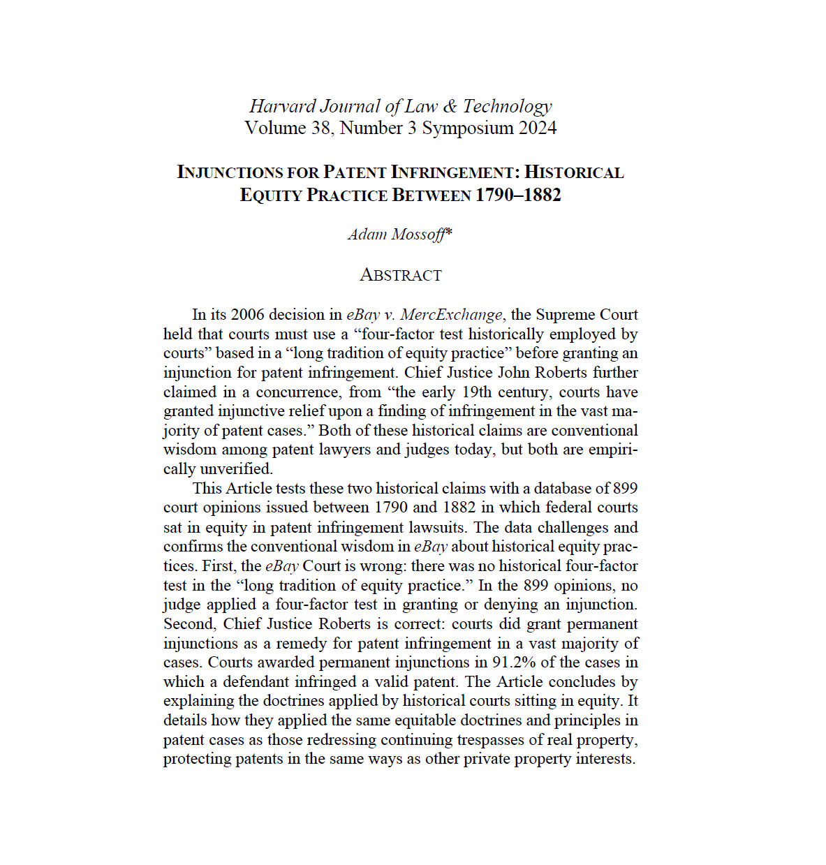 Adam Mossoff, Injunctions for Patent Infringement: Historical Equity Practice Between 1790 – 1882, 38 Harvard Journal of Law & Technology 923 (2025)